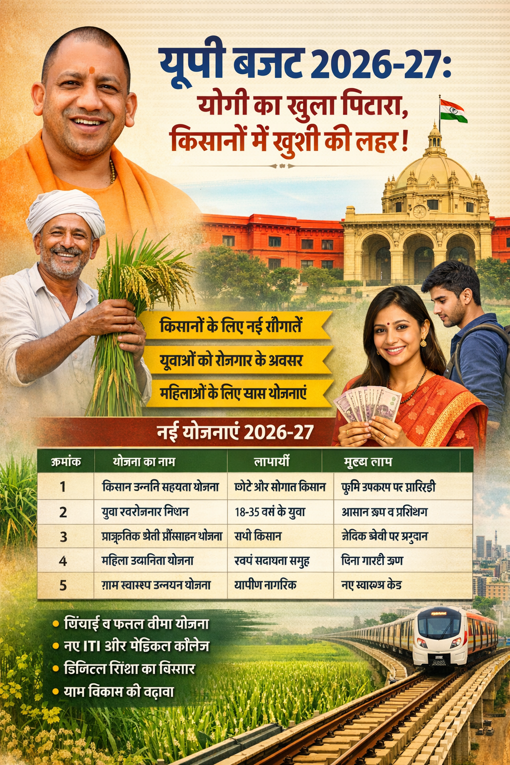 उत्तर प्रदेश सरकार ने वित्तीय वर्ष 2026-27 का बजट पेश करते हुए विकास, रोजगार और किसान कल्याण को प्राथमिकता दी है। मुख्यमंत्री योगी आदित्यनाथ के नेतृत्व में पेश किया गया यह बजट ग्रामीण और शहरी दोनों क्षेत्रों के लिए कई नई संभावनाएं लेकर आया है।